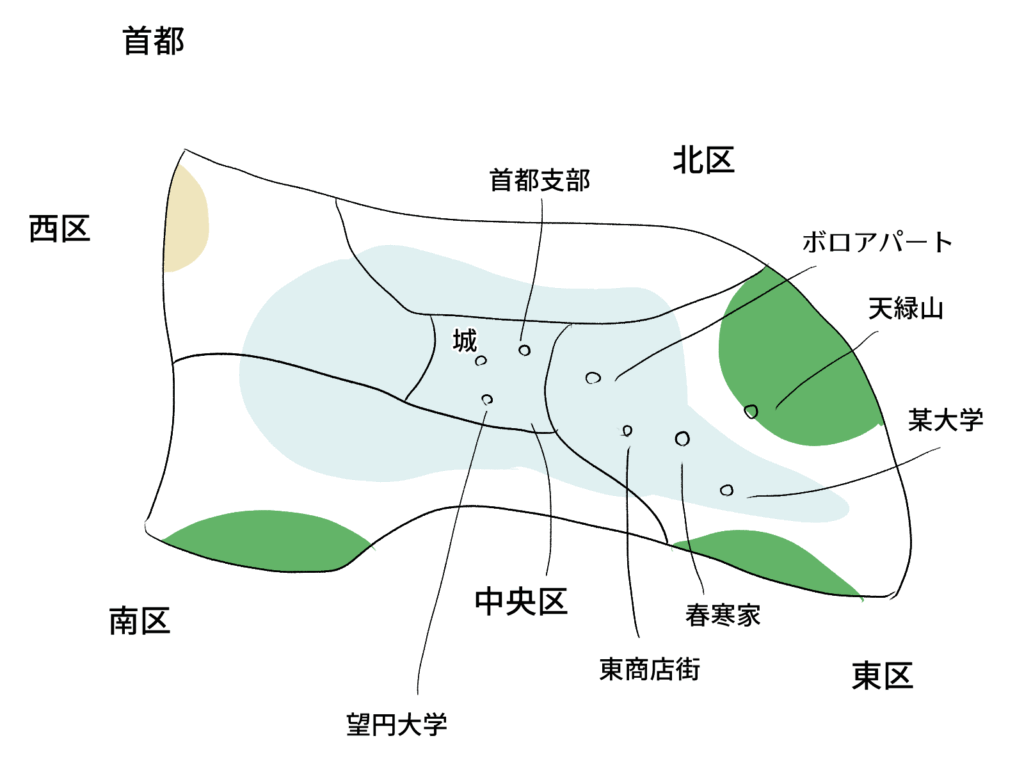望円国の中心都市。中央区、東区、北区、西区、南区の5つに区分されている。