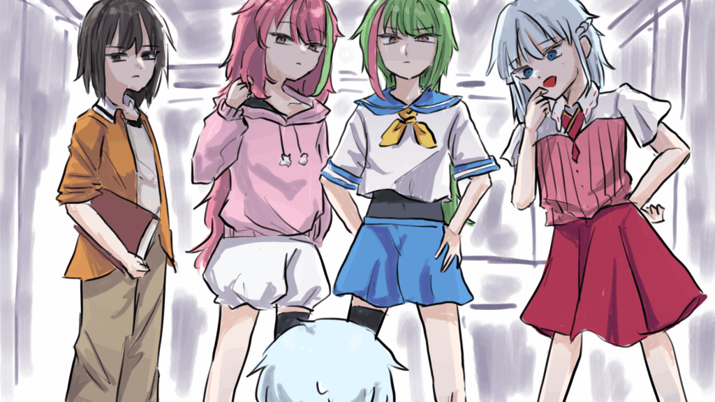 それ以外に、先程のピンク髪メッシュに、血縁らしき黄緑髪メッシュの人物、更に分厚い本を持った黒髪の人物がいた。